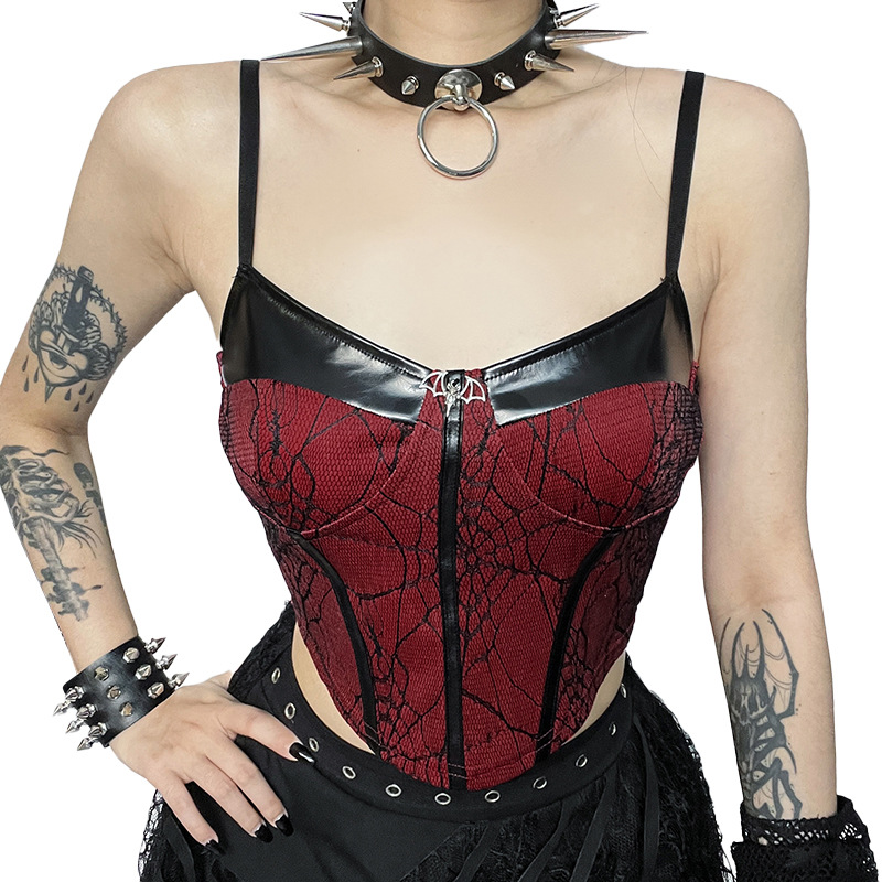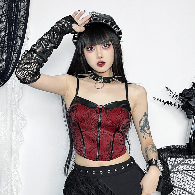 Gothic Punk Red Spiderweb Patchwork Crop Tank Top